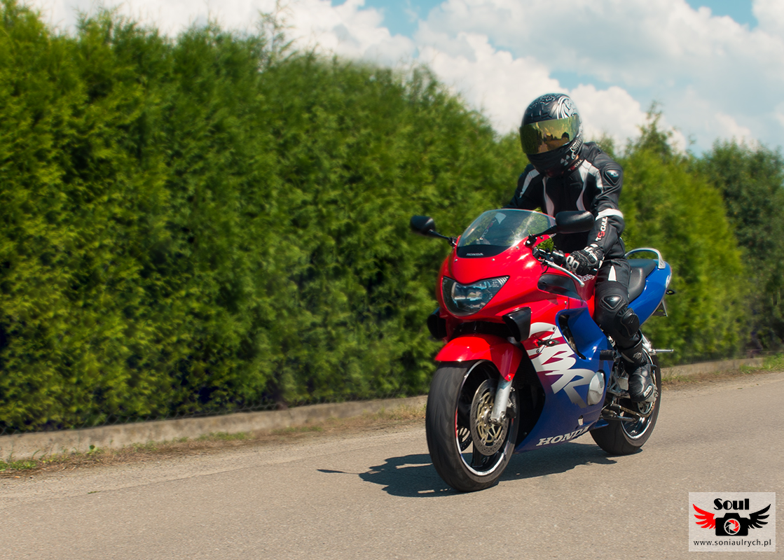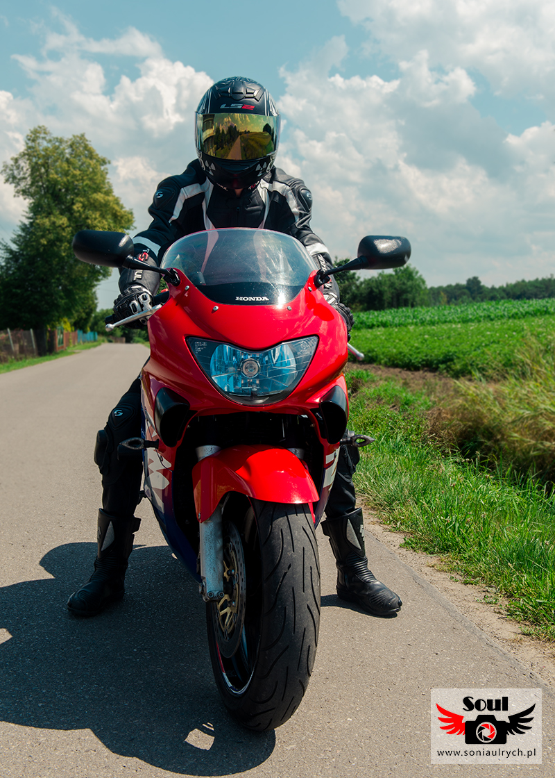 Ostatnio miałam okazję fotografować motocyklistę. Mini sesja trwała bardzo szybko, udało nam się zrobić zaledwie 3 zdjęcia. Mój model powiedział: ,,Ciężko jest wytrzymać w skórze w taki upał jak się stoi, ona jest przystosowana do jazdy, nie do stania.” Podczas sesji było ok. 30 stopni C. Następna sesja już zaplanowana, w chłodniejsze dni, dlatego jestem pewna ze zrobimy więcej zdjęć. Pod kaskiem motocyklisty ukrywa się mój kuzyn, który zawsze mówi: ,,Myślisz ze motocyklista to wariat? Grubo się mylisz, bo to ludzie z wielką pasją i umiejętnościami.”