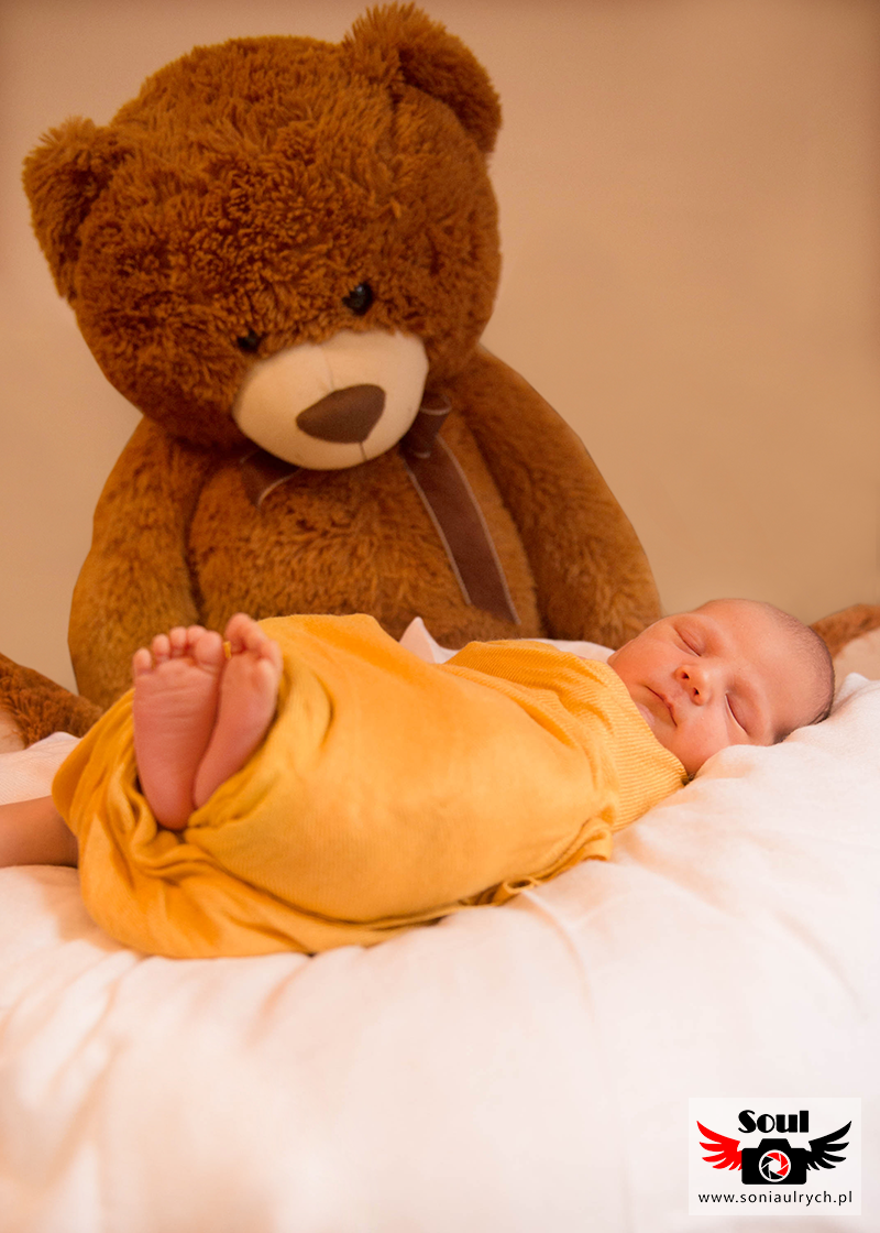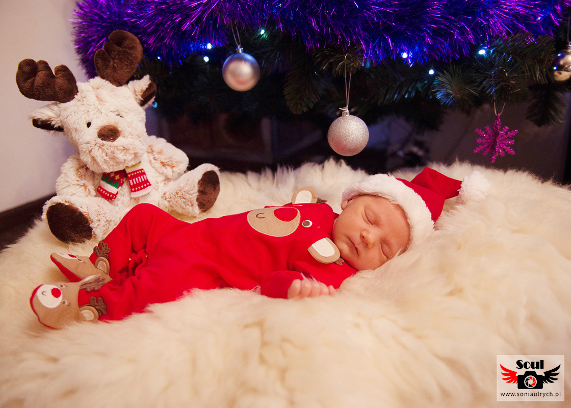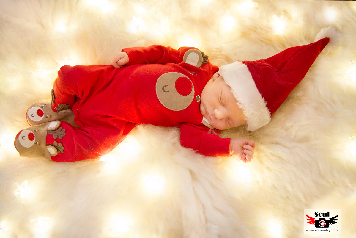 U mnie magię świąt wypełnił 11 dniowy Oliwier ♥ Początkowo nie chciał ze mną współpracować i był bardzo ciekawy, co się dzieje, kim jestem, co tutaj robię, co trzymam w ręku? Wszystkie próby uśpienia i karmienia nie dawały oczekiwanego efektu – Olivier dalej nie spał. Po długich próbach się zmęczył i zamknął swoje oczka. W tedy ja mogłam wkroczyć do akcji i zrobić mu zdjęcia. Spał tak długo, że po skończonej sesji na spokojnie mogłam się spakować i wyjść, ponieważ sesja odbyła się w jego domu. Na do widzenia na jego twarzy zagościł słodki uśmiech:)